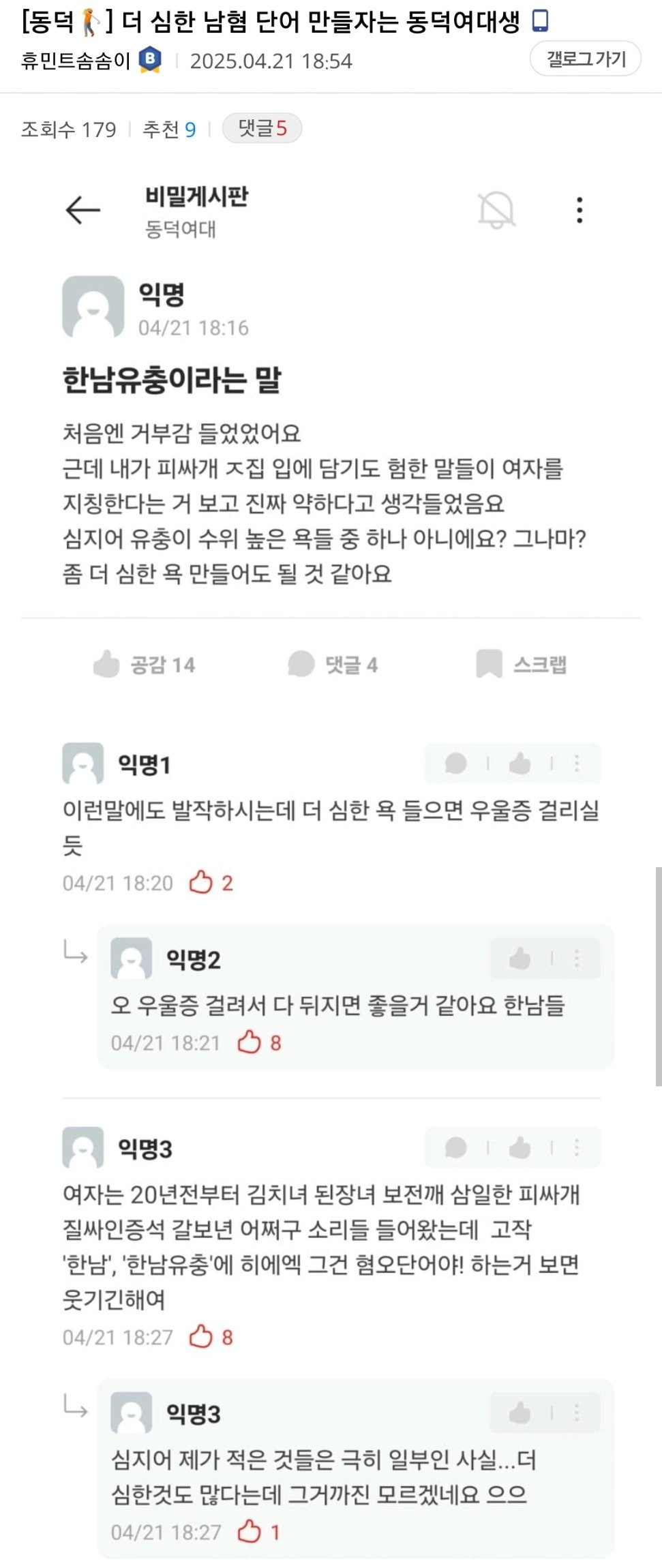 더 심한 남혐 단어 만들자는 동덕여대생 푸른바다 0 934 0 05.26 16:34 link URL 복사: https://view.humorpick.com/bbs/board.php?bo_table=humor&wr_id=382459 0