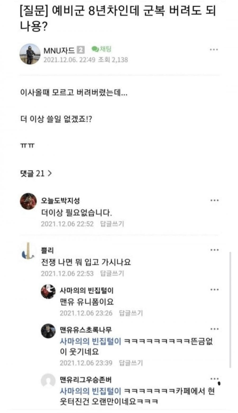 예비군 8년차인데 군복 버려도 되나요? 버디버디 0 1278 0 05.25 18:51 link URL 복사: https://view.humorpick.com/bbs/board.php?bo_table=humor&wr_id=382372 0