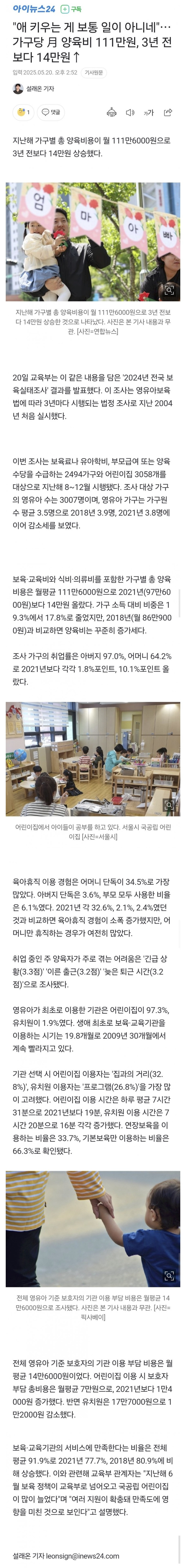 "애 키우는 게 보통 일이 아니네"⋯가구당 月 양육비 111만원 포트리쯔 0 749 0 05.25 04:51 link URL 복사: https://view.humorpick.com/bbs/board.php?bo_table=humor&wr_id=382316 https://n.news.naver.com/mnews/article/031/0000933750 0