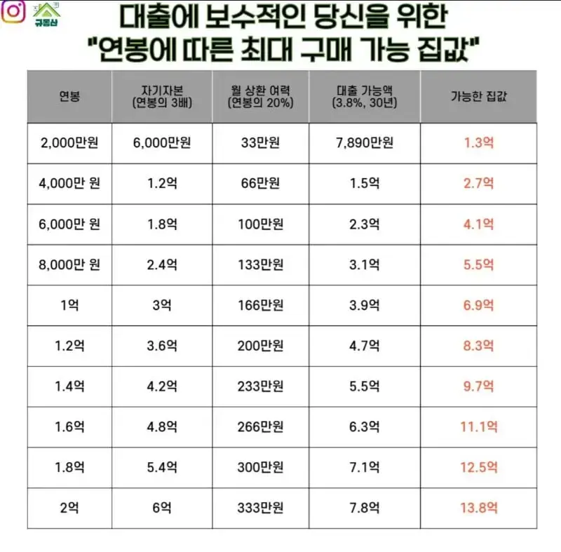 연봉에 따른 최대 구매 가능 집값 버디버디 0 685 0 05.23 10:27 link URL 복사: https://view.humorpick.com/bbs/board.php?bo_table=humor&wr_id=382055 일반 주담대 상품 기준인듯 가능한 집값은 찾았고 집값에 맞는 집을 찾아야 하는구만..실수령 1억이면 실제연봉이 얼마야 대체빚진 사람들 ㅋㅋ 은행은 나에겐 나에게 이자 바치는 기관 0