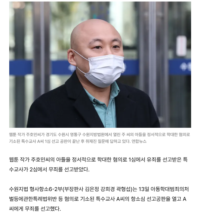 웹툰 작가 주호민 아들 아동학대 혐의’ 특수교사 항소심서 무죄 아기물티슈 0 725 0 05.15 00:51 link URL 복사: https://view.humorpick.com/bbs/board.php?bo_table=humor&wr_id=380938 항소심에서는 무죄 판결을 받으셨네요. 0