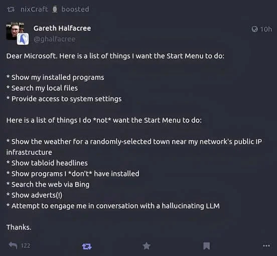 윈도 시작메뉴의 쓸데없는 기능.jpg 아기물티슈 0 1134 0 05.14 19:51 link URL 복사: https://view.humorpick.com/bbs/board.php?bo_table=humor&wr_id=380918 마이크로소프트 귀하여기 시작 메뉴에 제가 넣어줬으면 하는 것들입니다- 설치된 프로그램 표시하기- 로컬 파일 검색하기- 시스템 설정 들어가기그리고 시작 메뉴에서 좀 집어치웠으면 하는 것들입니다- 네트워크 공용 IP를 가지고 무작위로 선택된 지역 날씨- 연예 가십 기사- 설치하지 않은 프로그램 표시- 빙을 통해 웹 검색하기- 광고 표시 - 약빤것 같은 AI와 자꾸 대화시키려하기 진짜 연예 가십이랑 광고 좀 없애라 0