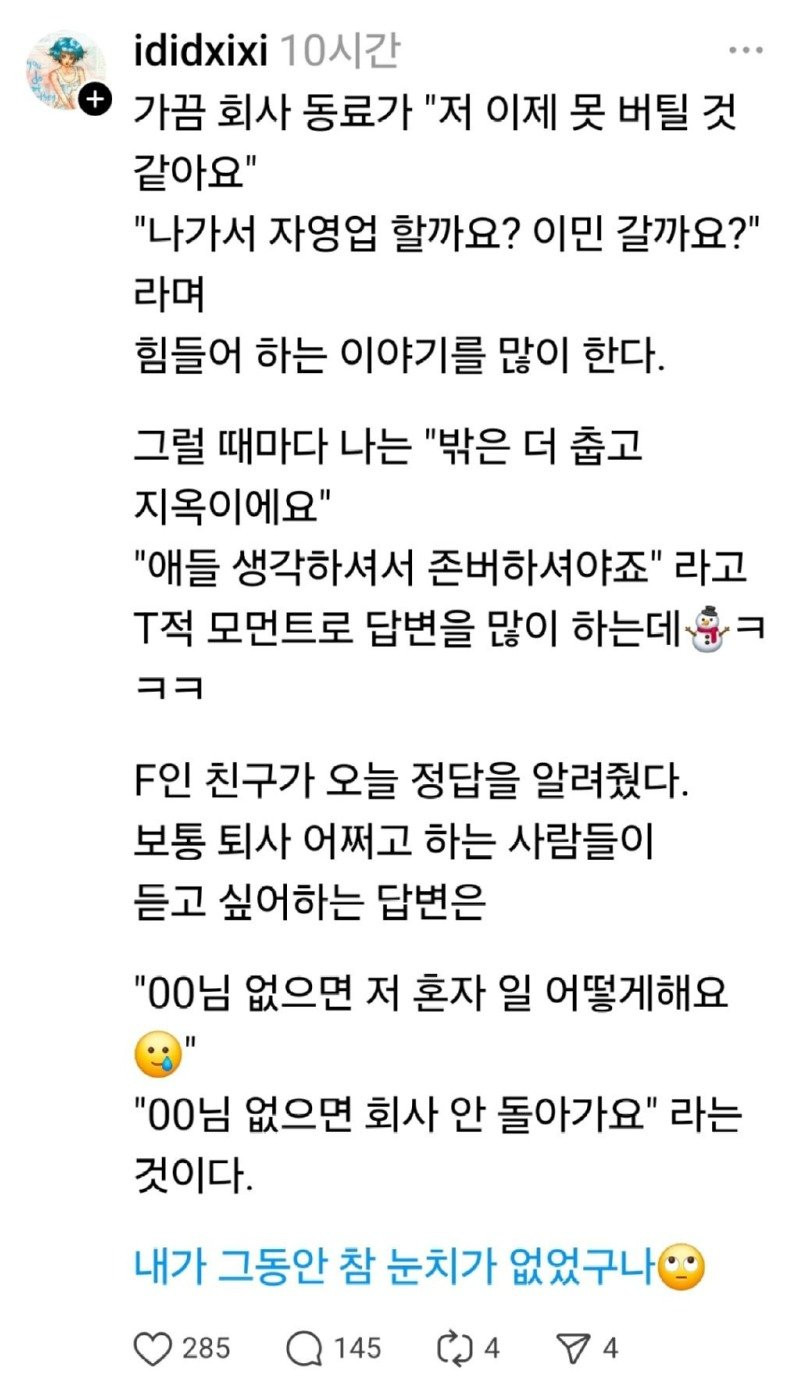 퇴사 어쩌고 하는 사람들이 듣고 싶어하는 말 픽시베이 0 971 0 05.28 16:17 link URL 복사: https://view.humorpick.com/bbs/board.php?bo_table=humor&wr_id=382651 0