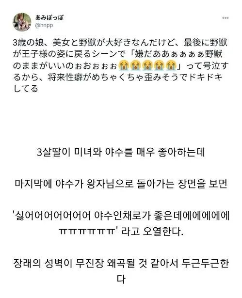 3살 딸이 미녀와 야수 결말을 보고 운 이유 슬라임 0 291 0 5시간전 link URL 복사: https://view.humorpick.com/bbs/board.php?bo_table=humor&wr_id=397274 0