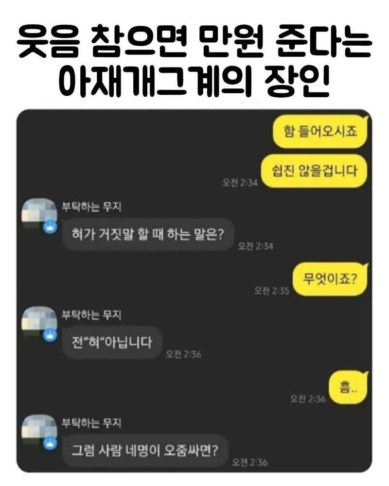 장인이 말아주는 아재개그.jpg 라이츄 0 135 0 2시간전 link URL 복사: https://view.humorpick.com/bbs/board.php?bo_table=humor&wr_id=397947 장인 한 아재 라 나를 욕하지는 마 0