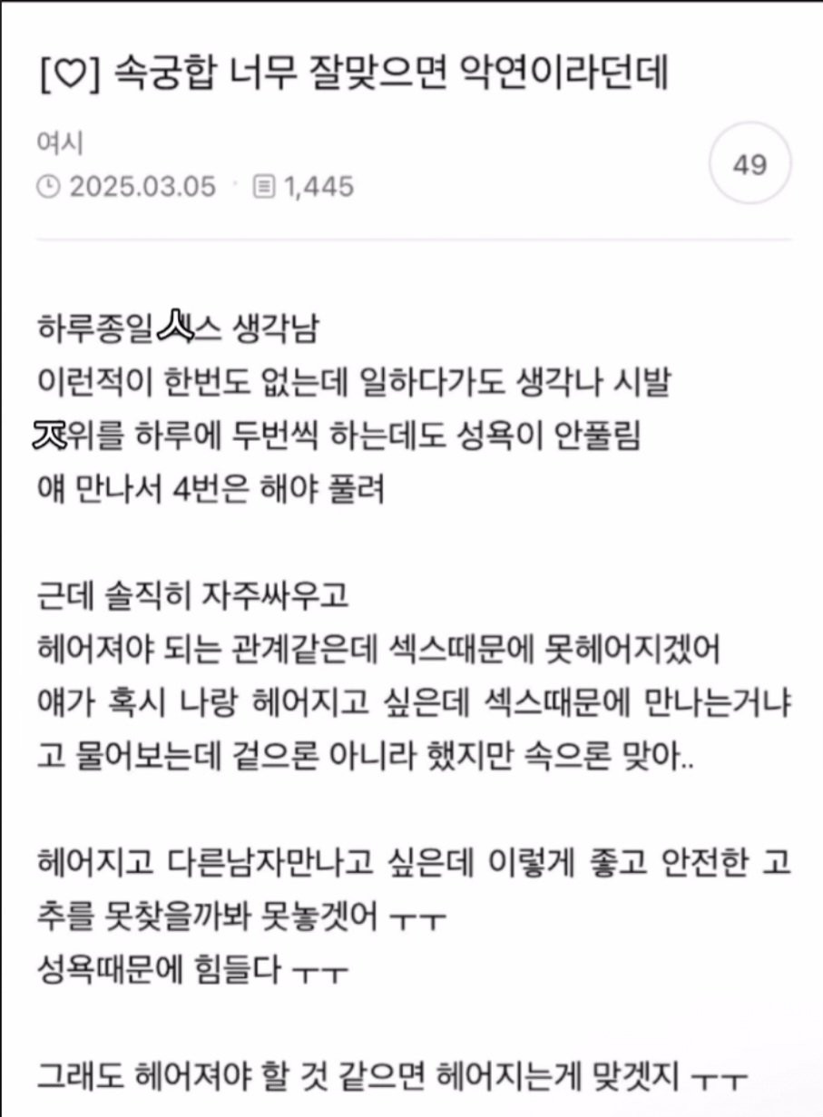 19)속궁합 너무 잘맞으면 악연이라는데 포트리쯔 0 227 0 2시간전 link URL 복사: https://view.humorpick.com/bbs/board.php?bo_table=humor&wr_id=398478 0