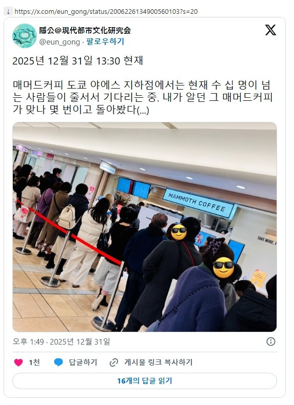 매머드커피 도쿄 야에스점 사람들 줄선 오픈 상황 수민이에여 0 304 0 2시간전 link URL 복사: https://view.humorpick.com/bbs/board.php?bo_table=humor&wr_id=398807 0