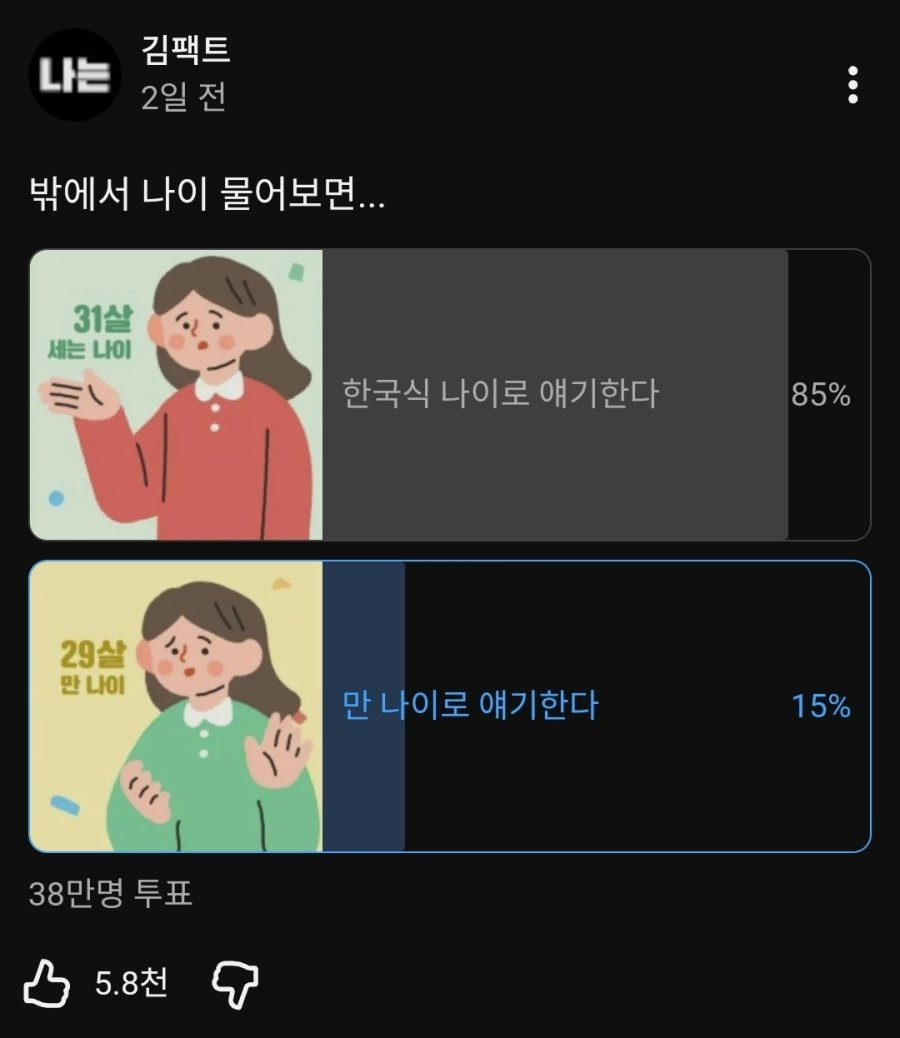 밖에서 나이 물어 보면 만나이 vs 한국식 나이 픽시베이 0 264 0 2시간전 link URL 복사: https://view.humorpick.com/bbs/board.php?bo_table=humor&wr_id=398898 많이 바뀌었다곤 하지만 아직도 한국식 나이로 말하는게 압도적인가 보네요 특히 저는 나이드신 어른분들하고 말할때는 대부분 한국식 나이로 다 계산하시드라구요 0
