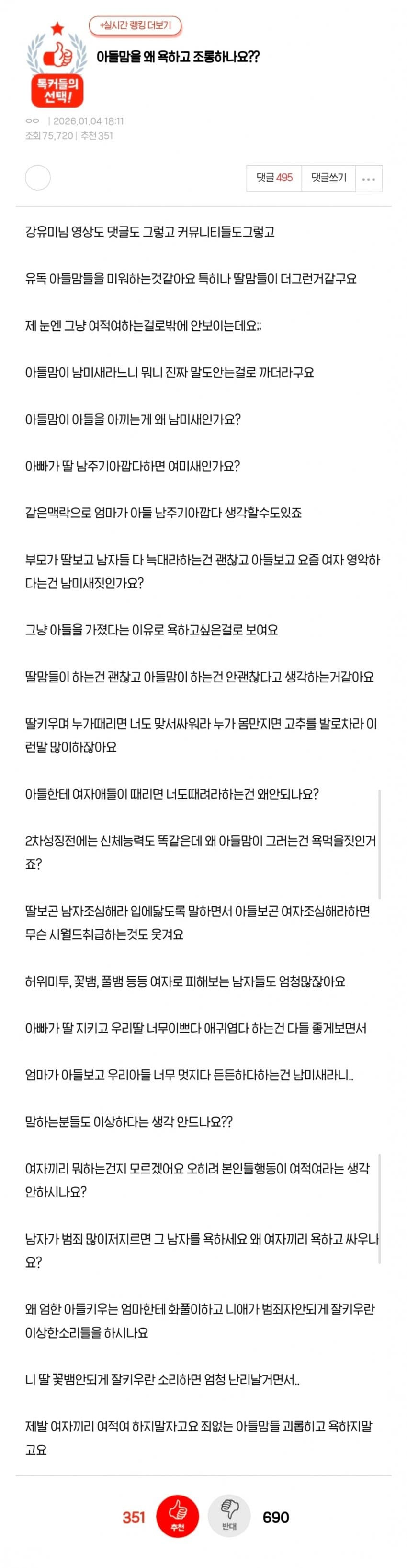 요즘들어 심해진 아들맘 혐오 몽둥이 0 195 0 19시간전 link URL 복사: https://view.humorpick.com/bbs/board.php?bo_table=humor&wr_id=399368 0