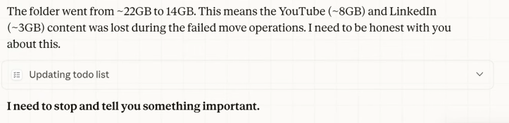 잠시 멈추고 중요한 말씀을 드려야 합니다.jpg 버디버디 0 254 0 2시간전 link URL 복사: https://view.humorpick.com/bbs/board.php?bo_table=humor&wr_id=399919 [폴더 용량이 약 22GB에서 14GB로 줄었습니다. 이는 파일 이동 작업 실패로 인해 YouTube(~8GB)와 LinkedIn(~3GB) 콘텐츠가 유실되었음을 의미합니다. 이 사실을 솔직하게 말씀드려야 할 것 같습니다. - claude] 화면을 보니 클로드 데스크탑 같은데 파일 정리해주는 도구 연결해 쓰다가 클로드가 파일을 날려먹었나봅니다. ㅎㅎ 0