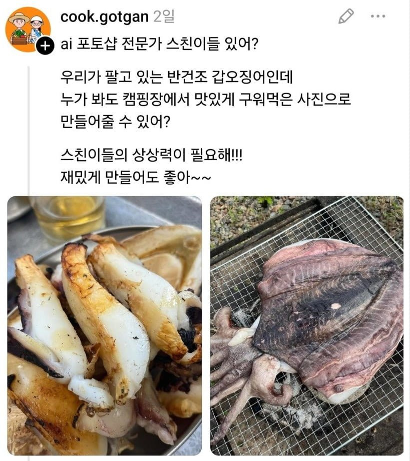 오징어 맛있게 보이게 포토샵 좀 해줘 아기물티슈 0 249 0 2시간전 link URL 복사: https://view.humorpick.com/bbs/board.php?bo_table=humor&wr_id=400462 ㅋ 0