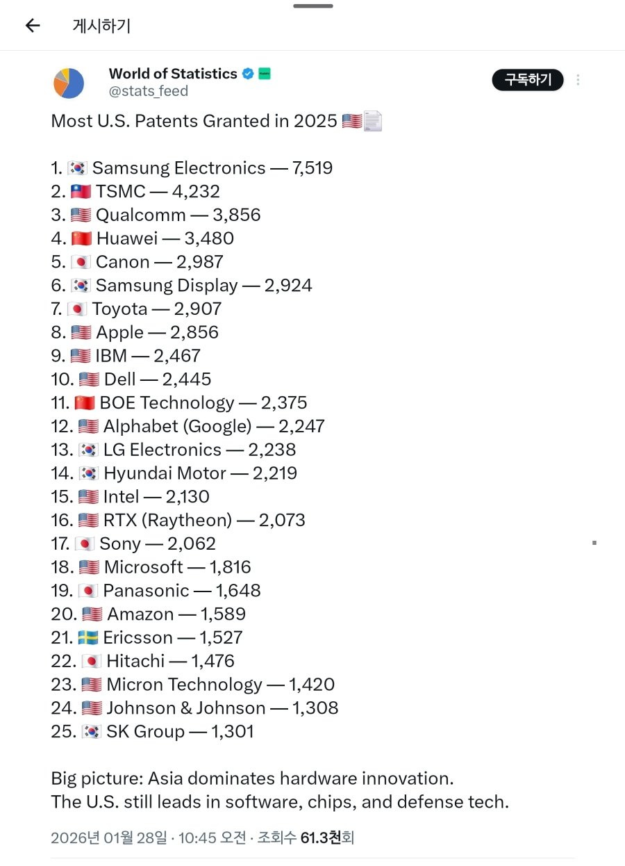 2025 부여된 미국 특허 기업 순위 칠성그룹 0 218 0 2시간전 link URL 복사: https://view.humorpick.com/bbs/board.php?bo_table=humor&wr_id=401046 0