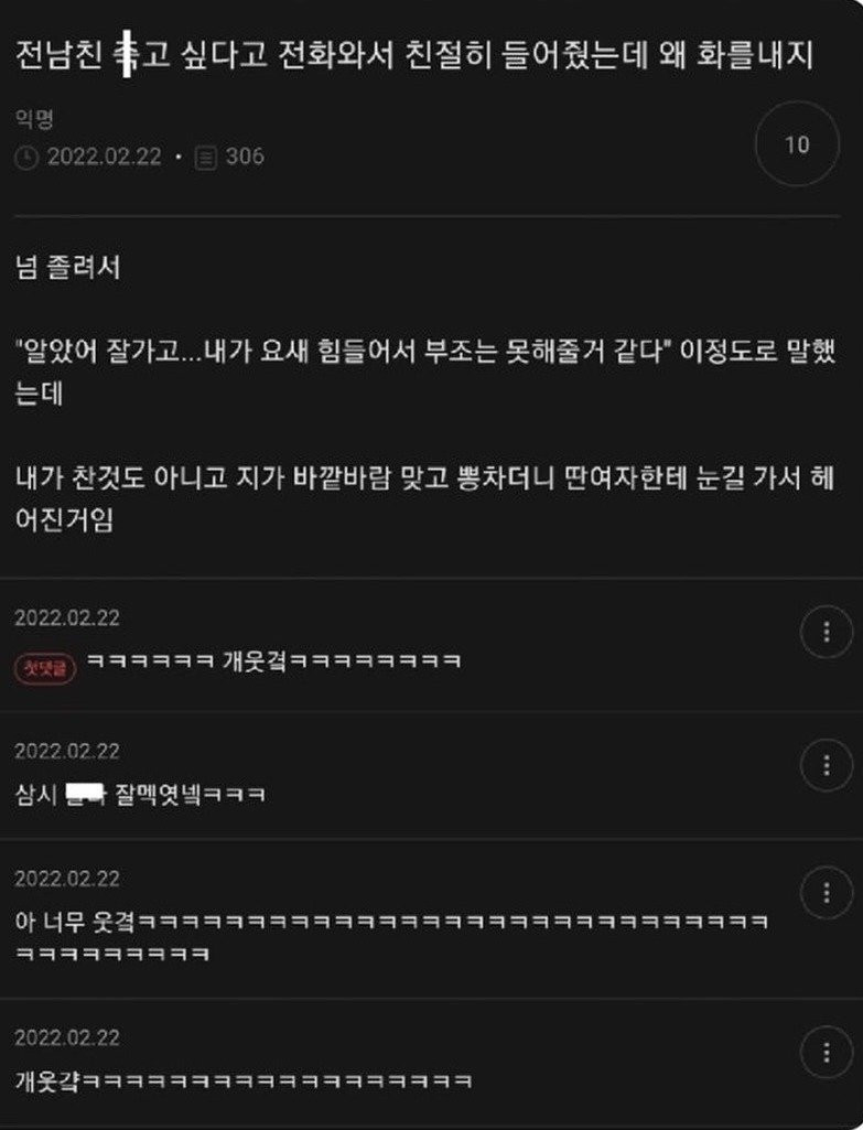 전남친 죽고 싶다고 전화와서 친절히 들어줬는데 왜 화를 내지 라이츄 0 164 0 2시간전 link URL 복사: https://view.humorpick.com/bbs/board.php?bo_table=humor&wr_id=401664 0