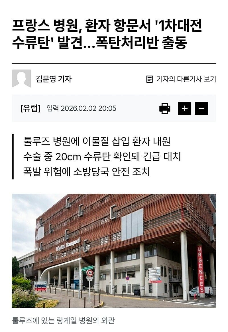 프랑스 병원 환자 항문에서 1차대전 수류탄 발견.jpg 버디버디 0 246 0 2시간전 link URL 복사: https://view.humorpick.com/bbs/board.php?bo_table=humor&wr_id=401750 0