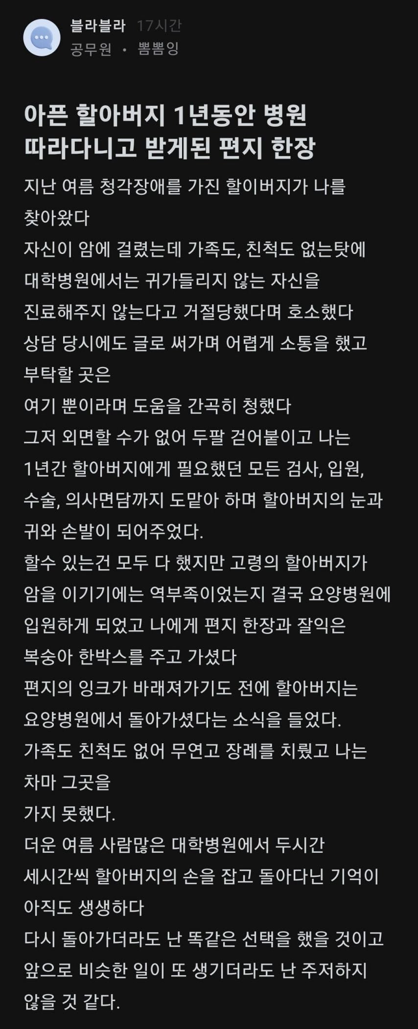 어느 공무원이 받은 편지 한장.jpg 버디버디 0 285 0 2시간전 link URL 복사: https://view.humorpick.com/bbs/board.php?bo_table=humor&wr_id=402975 이 문장이 보이면 video 태그를 지원 하지 않는 브라우저 입니다. 0