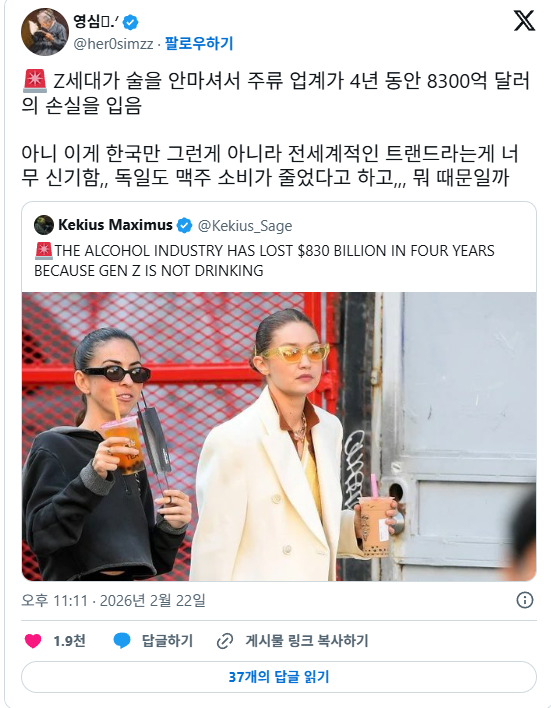 전세계 주류업계 비상 "Z세대들이 술을 안 마신다" 푸른바다 0 301 0 2시간전 link URL 복사: https://view.humorpick.com/bbs/board.php?bo_table=humor&wr_id=403469 0