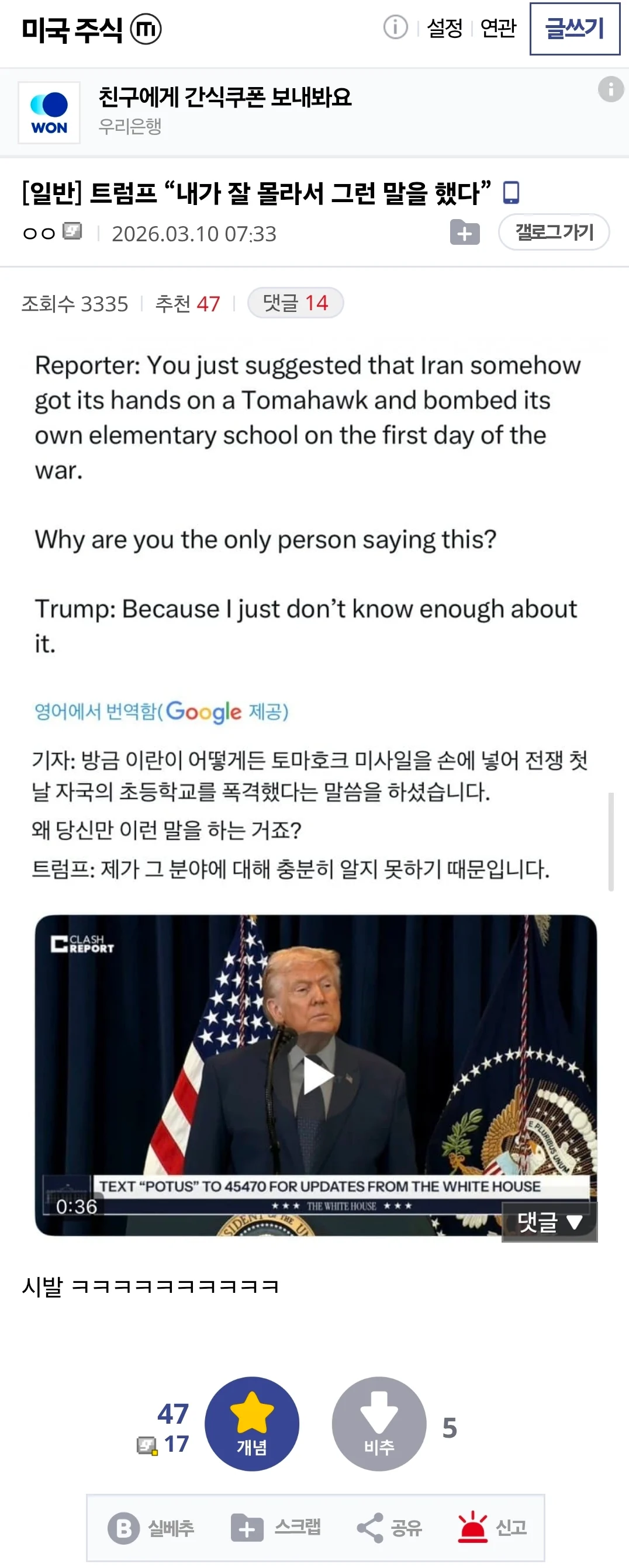 트럼프 “내가 잘 몰라서 그런 말을 했다” 픽시베이 0 313 0 3시간전 link URL 복사: https://view.humorpick.com/bbs/board.php?bo_table=humor&wr_id=404862 몰?루 입갤 0