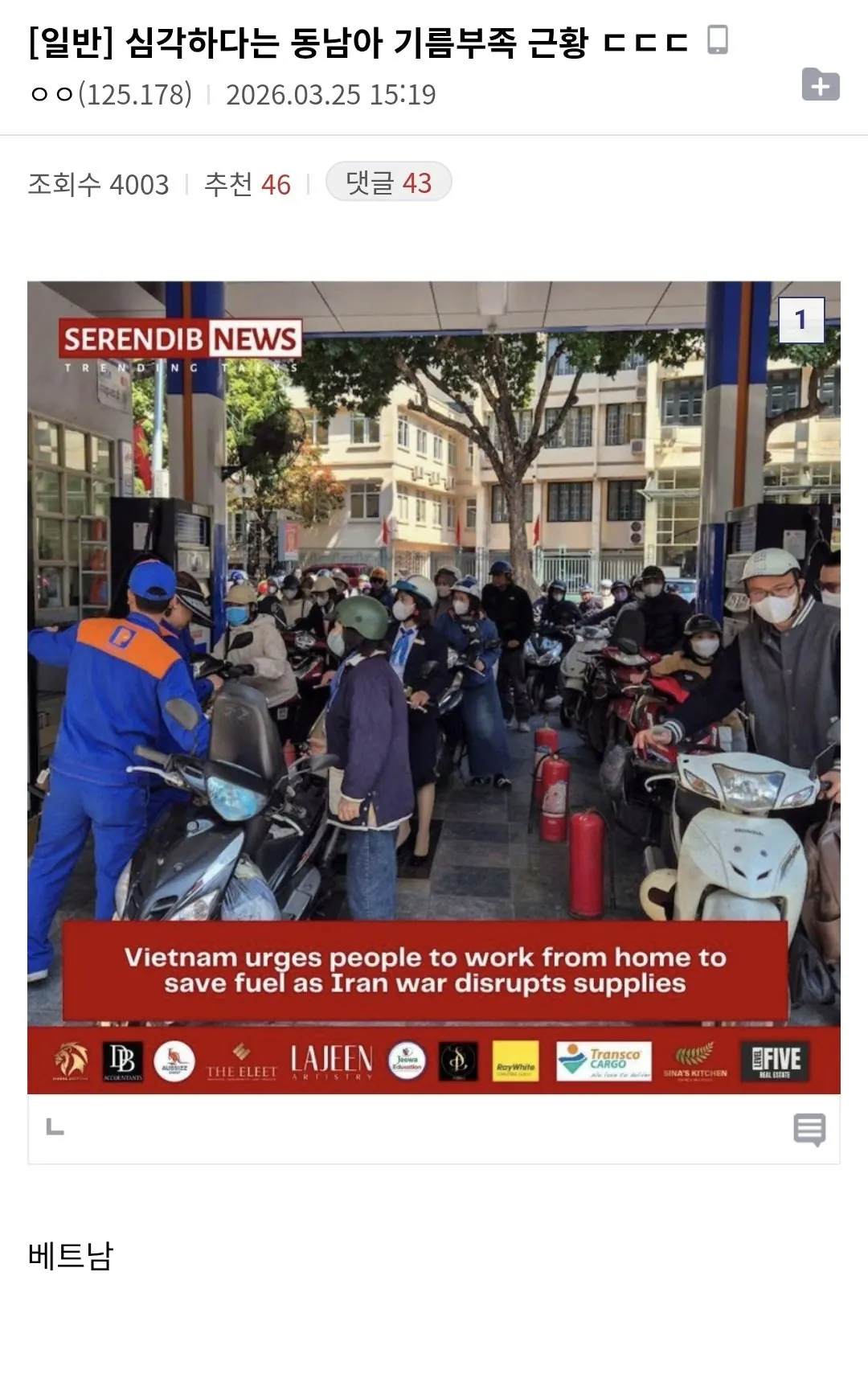 현재 심각하다는 동남아 기름 부족 근황 Pixel 0 291 0 2시간전 link URL 복사: https://view.humorpick.com/bbs/board.php?bo_table=humor&wr_id=406323 출처: https://m.dcinside.com/board/stockus/14887371?recommend=1 0