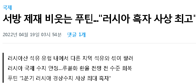 러시아가 우크라이나를 침공한 지 60일이 넘어가는 현재,  위 뉴스처럼 러시아의 경상수지가 흑자를 사상최고치를 기록했다고 합니다. 푸틴은 이를 선전하며 서방의 제재가 전혀 먹히지 않고 있다고 자랑하고 있습니다.