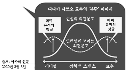 또한 츠지 교수는 인터넷은 자극적이고 임팩트가 강한 가짜 뉴스가 사실보다 더 확산되기 쉬운 경향이 있고, 인터넷 이용 시간이 긴 사람일수록 극단적인 성향이 두드러진다고 말했다.