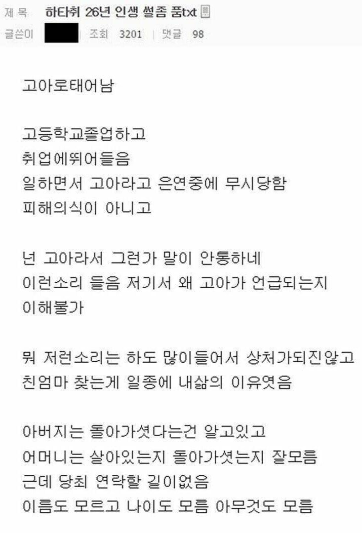 마인드 좋은 26세 고아의 인생 썰.jpg 아기물티슈 0 343 0 5시간전 link URL 복사: https://view.humorpick.com/bbs/board.php?bo_table=ssul&wr_id=1565 0