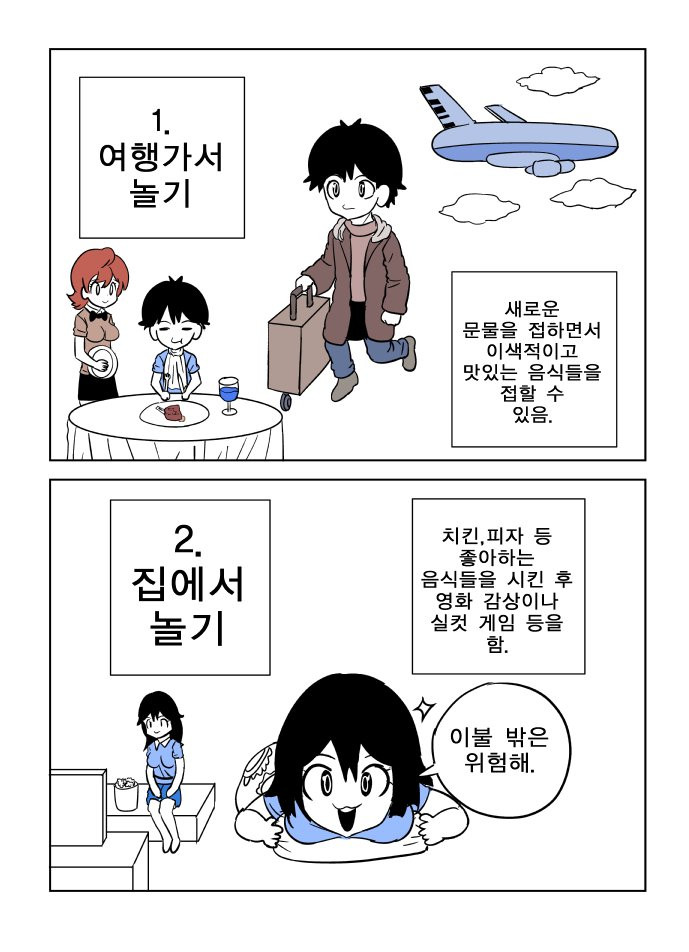 여행가서 놀기 vs 집에서 놀기 만화 큐플레이 0 277 0 5시간전 link URL 복사: https://view.humorpick.com/bbs/board.php?bo_table=toon&wr_id=6859 여러분들은 어떤걸 택하실건가요? ㅋㅋㅋ 0